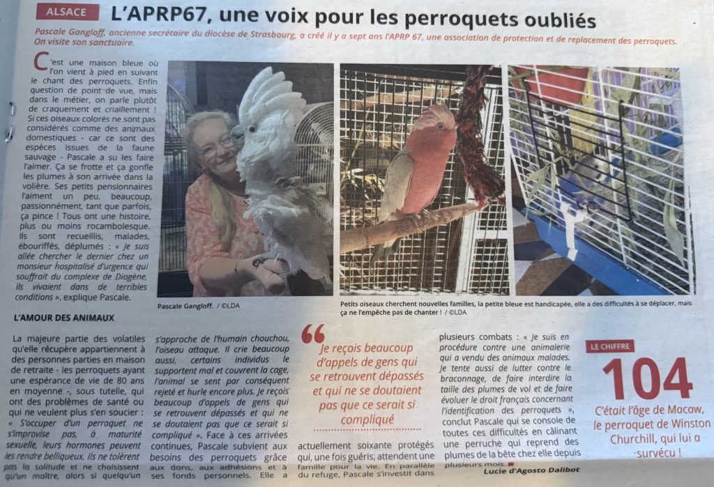 Pascale Gangloff, ancienne secrétaire du diocèse de Strasbourg, a fondé il y a sept ans l’association APRP67, un sanctuaire dédié au sauvetage, à la protection et au replacement des perroquets. Dans sa maison transformée en refuge, elle accueille des oiseaux souvent abandonnés, maltraités ou livrés à eux-mêmes après la disparition ou l’épuisement de leurs propriétaires, notamment des personnes âgées.